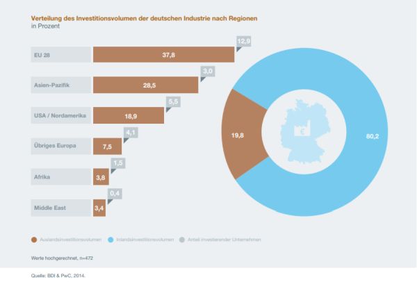 Da der Deutsche Mittelstand regional verwurzelt ist, investieren die Unternehmen des Mittelstands vor allem in den Regionen, aus denen sie ursprünglich herkommen. Am Ende steht eine hohe Beschäftigungszahl zuhause in Verbindung mit Exporten ins Ausland. Im Jahr 2014 investierten sie 80,2 Prozent ihres Investitionsvolumens für Sachanlagen im Inland. Mehr als acht von zehn Unternehmen investieren ausschließlich in Deutschland, so der BDI.