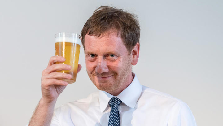Michael Kretschmer (CDU), Ministerpräsident von Sachsen, hält im Dülfersaal der TU nach einer Live-Übertragung der Pressekonferenz des Wissenschaftsrates aus dem Wissenschaftszentrum Bonn zur Entscheidung der Exzellenzkommission ein Glas Bier hoch (19.07.2019). (Foto: dpa) Foto: Robert Michael