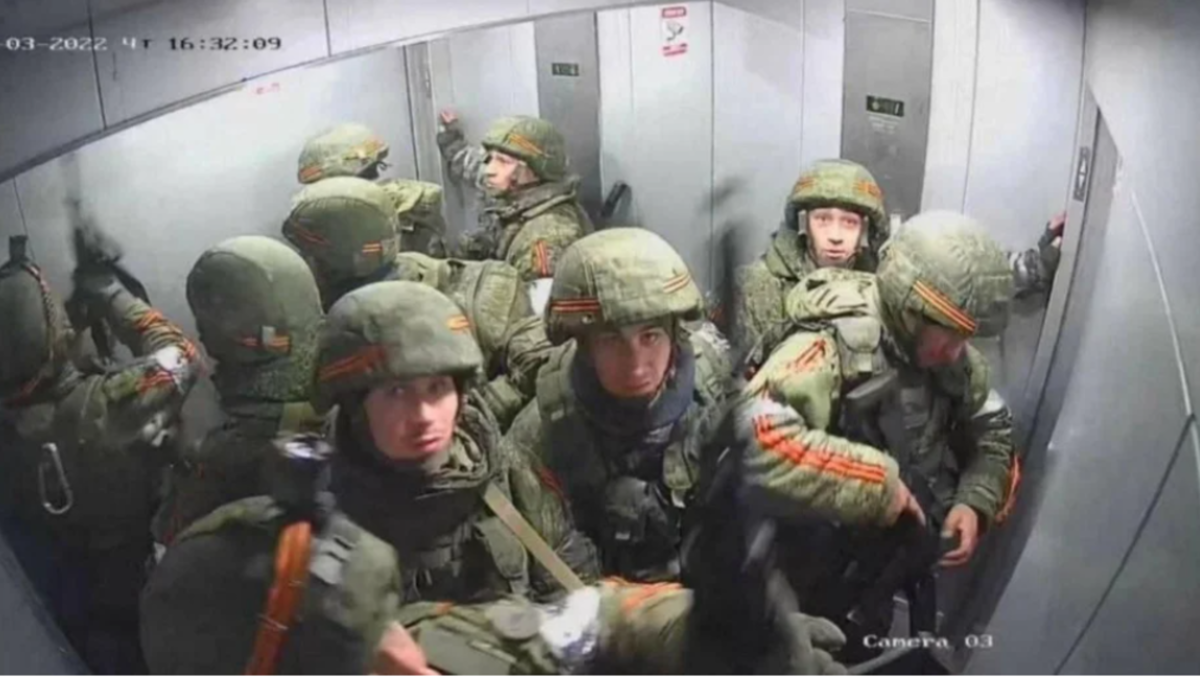 Russische Soldaten in einem Fahrstuhl in Charkiw. (Screenshot via Twitter/Visegrád 24)