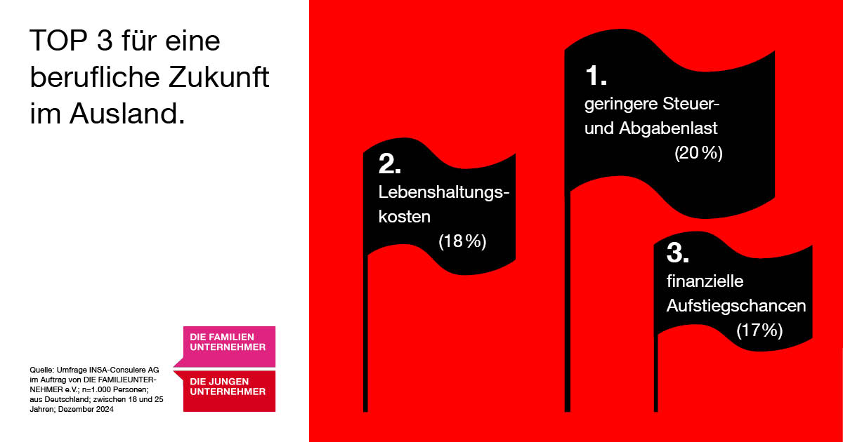 Eine relative Mehrheit von 46 Prozent der Befragten hat schon einmal in Erwägung gezogen, Deutschland aus wirtschaftlichen Gründen zu verlassen (17 Prozent absolut, 29 Prozent eher). 54 Prozent der Befragten können sich vorstellen, eine berufliche Zukunft im Ausland aufzubauen. Die meistgenannten Gründe dafür sind geringere Steuern und Abgaben, Lebenshaltungskosten und finanzielle Aufstiegschancen.