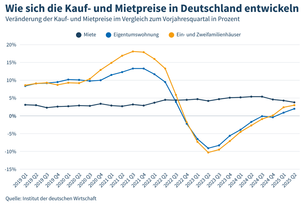 "Der Immobilienmarkt tritt in eine neue Phase ein: Die Kaufpreise gingen nicht mehr flächendeckend zurück, stattdessen entwickelten sie sich regional unterschiedlich. Zentrale Lagen in Metropolen haben wieder an Wert gewonnen, während das Umland sich langsam erholt", sagt IW-Immobilienexperte Pekka Sagner. Gleichzeitig bleiben die Mietmärkte angespannt – bedingt durch Angebotsengpässe, demografischen Wandel und eine zurückhaltende Bautätigkeit.