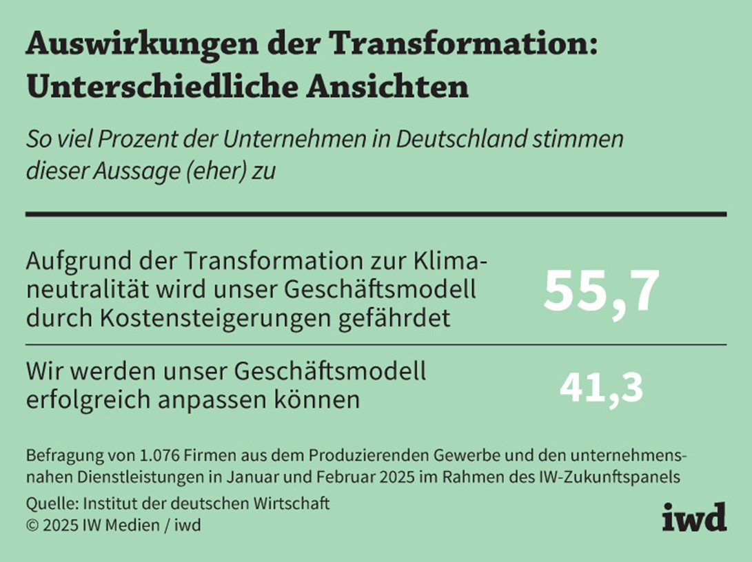 Diese politischen Unsicherheiten schlagen sich zunehmend auch im Stimmungsbild der Unternehmen nieder. Dies zeigen neue Zahlen aus dem Transformationskompass des Instituts der deutschen Wirtschaft (IW): 55,7 Prozent der befragten Unternehmen sehen ihr Geschäftsmodell durch steigende Klimatransformationskosten gefährdet, nur 41,3 Prozent glauben, sich erfolgreich anpassen zu können.