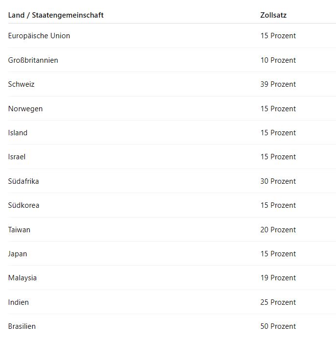 Der Regierungsbeamte erklärte gegenüber der dpa, warum das Inkrafttreten der neuen US-Zölle nun doch nicht auf diesen Freitag fällt: Ziel sei es, mehr Zeit für die Umsetzung der neuen Regelungen zu ermöglichen. Das Weiße Haus veröffentlichte dazu eine Liste mit fast 70 Ländern und der EU, auf die jeweils spezifische Zollsätze angewendet werden sollen. Neben Großbritannien, der Schweiz und Japan werden darin zahlreiche weitere Handelspartner genannt.
