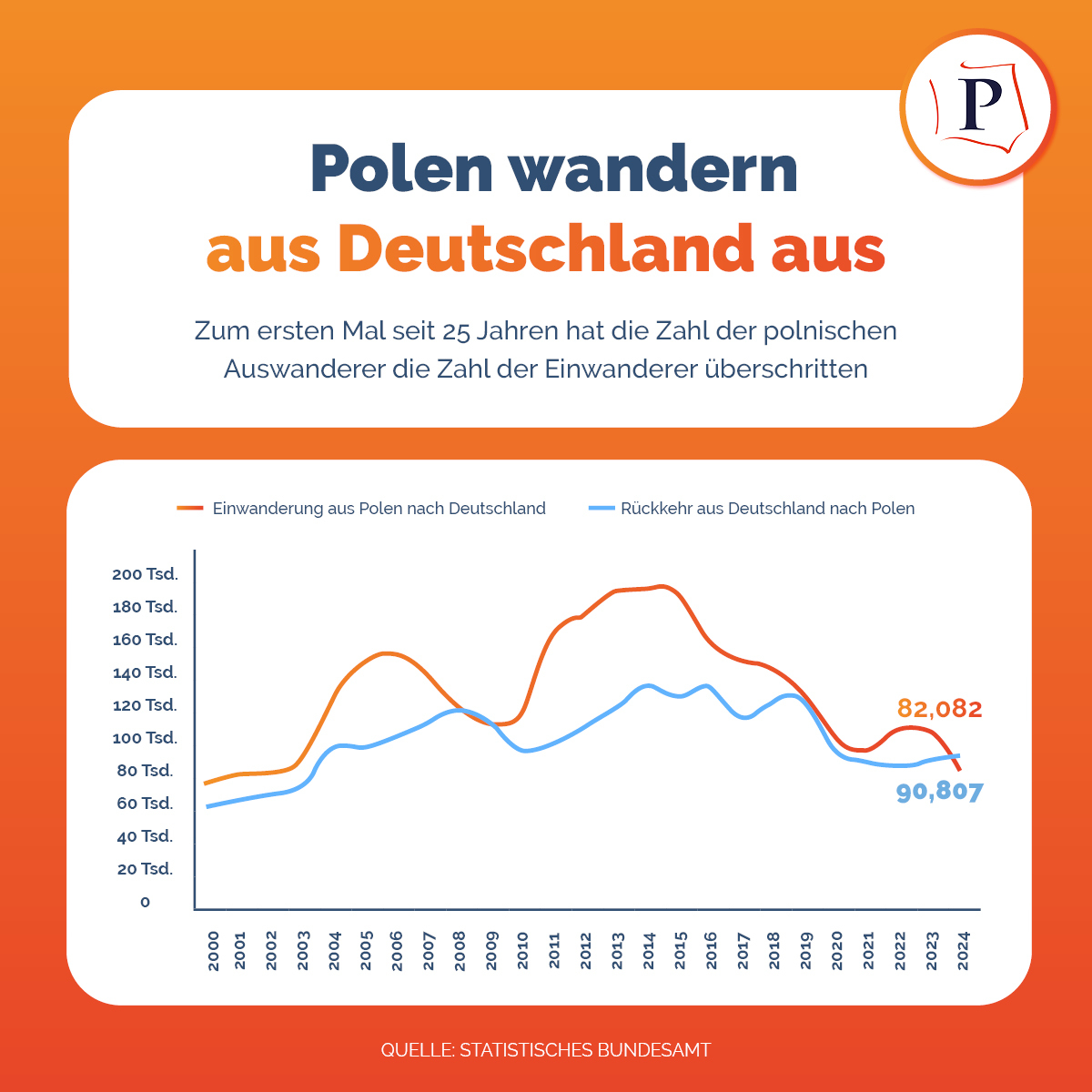 Seit Beginn der 1980er-Jahre hatte Deutschland ein kontinuierliches Zuwanderungsplus aus Polen zu verzeichnen. In der Regel kamen pro Jahr mehrere Zehntausend Menschen mehr aus Polen nach Deutschland als andersherum. Das hat sich jetzt erst verändert und umgekehrt: Erstmals in 25 Jahren sind mehr Menschen aus Deutschland nach Polen ausgewandert, als neue hinzugezogen. Das zeigen die Zahlen des Statistischen Bundesamtes für das Jahr 2024. Insgesamt zeigt die Wanderungsstatistik 95.107 Fortzüge bei 83.868 Zuzügen. Unter polnischen Staatsbürgern fällt der negative Saldo mit 88.388 zu 76.320 Wanderungen sogar noch etwas drastischer aus. Somit ergibt sich ein Defizit von 11.239 Personen.