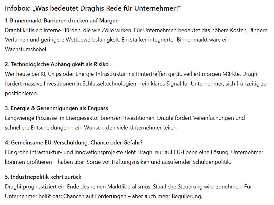 Für Deutschland ist Draghis Analyse besonders brisant: Als Exportnation hängt die Bundesrepublik am funktionierenden Binnenmarkt, an fairen Handelsregeln und am Zugang zu kritischen Technologien. Gleichzeitig ist sie in besonderem Maße von den US-Zöllen und globalen Lieferkettenverwerfungen betroffen. Deutschland steht damit vor der doppelten Aufgabe, seine industrielle Basis zu schützen und innerhalb der EU auf gemeinsame Finanzierungslösungen zu drängen – sonst droht ein Verlust an Wettbewerbsfähigkeit und technologischer Souveränität.