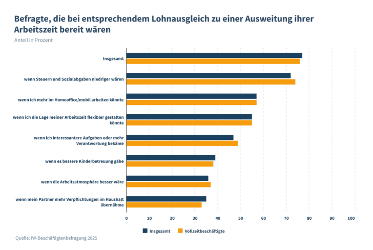 Eine aktuelle Befragung des Instituts der deutschen Wirtschaft (IW) ergibt, dass grundsätzlich große Bereitschaft zur Mehrarbeit vorhanden ist – allerdings nur unter bestimmten Bedingungen: 72 Prozent der Befragten knüpfen eine längere Arbeitszeit an die Bedingung niedrigerer Steuern und Sozialabgaben. Die finanziellen Aspekte sind den Beschäftigten mit Abstand am wichtigsten.