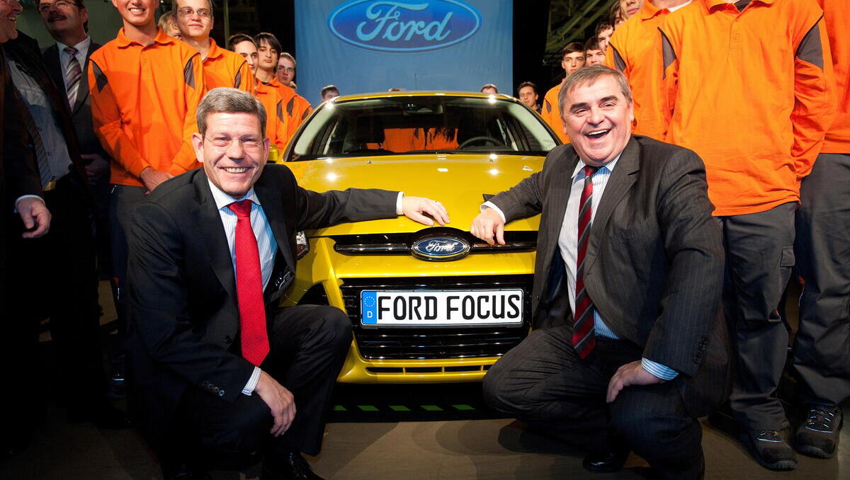 Bernhard Mattes (l), Vorsitzender der Geschäftsführung der Ford-Werke GmbH, und der saarländische Ministerpräsident Peter Müller präsentierten am Montag (06.12.2010) das Modell des neuen Ford Focus im Werk Saarlouis.