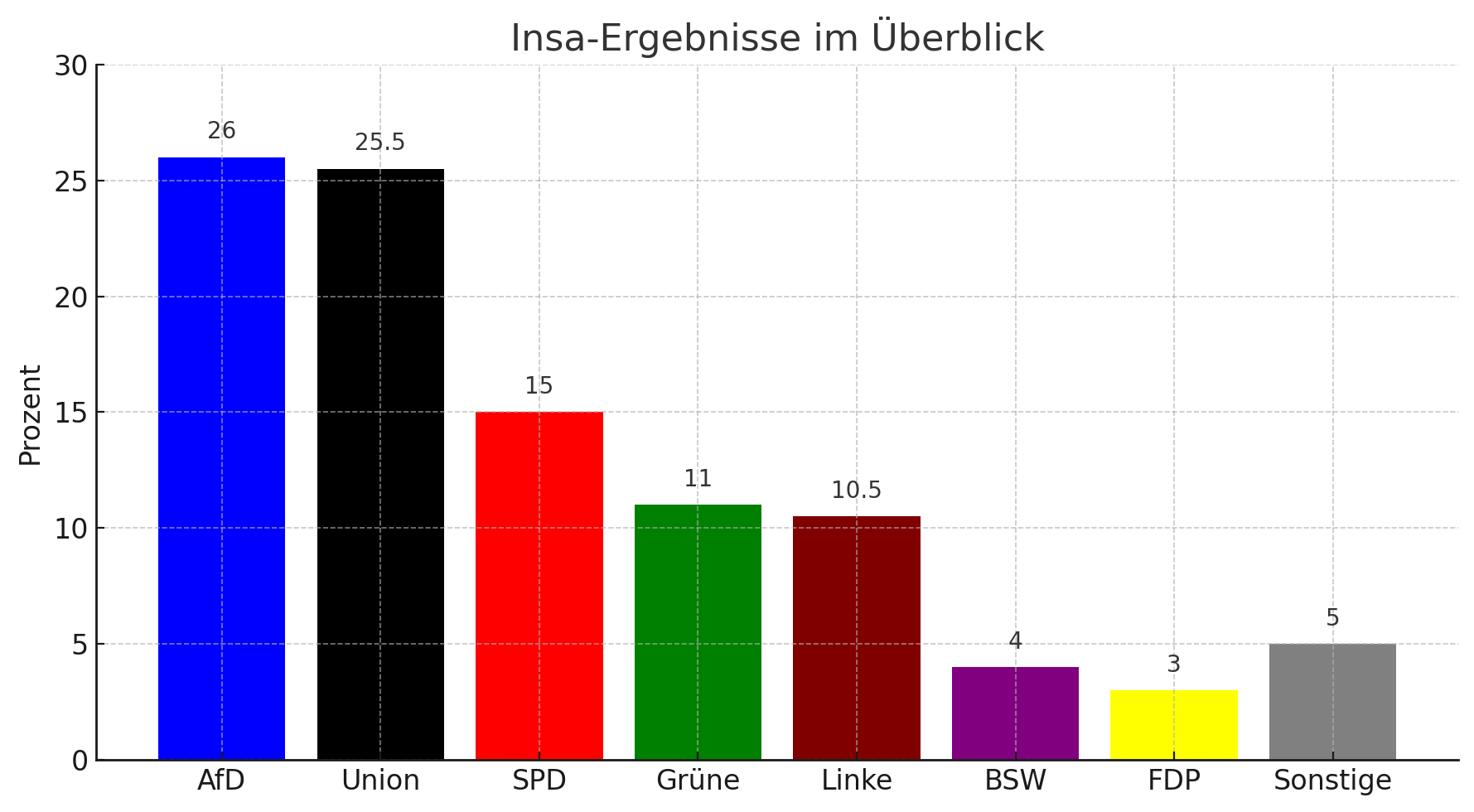 Die AfD bleibt in der Insa-Umfrage an der Spitze der bundesweiten Stimmung. Die aktuelle Insa-Umfrage bestätigt damit den seit Monaten sichtbaren Höhenflug: In der klassischen Sonntagfrage, also der Frage „Wen würden Sie wählen, wenn am nächsten Sonntag Bundestagswahl wäre?“, kommt die Partei erneut auf 26 Prozent. Damit liegt sie unverändert knapp vor der Union, die um 1 Prozentpunkt auf 25,5 Prozent zulegt. Die SPD hält 15 Prozent, die Grünen verharren bei 11 Prozent. Die Linke verliert leicht auf 10,5 Prozent (-0,5). Das BSW bleibt bei 4 Prozent, die FDP rutscht um einen halben Punkt auf 3 Prozent. Sonstige Parteien erreichen zusammen 5 Prozent. BSW und FDP würden damit weiter nicht in den Bundestag einziehen.