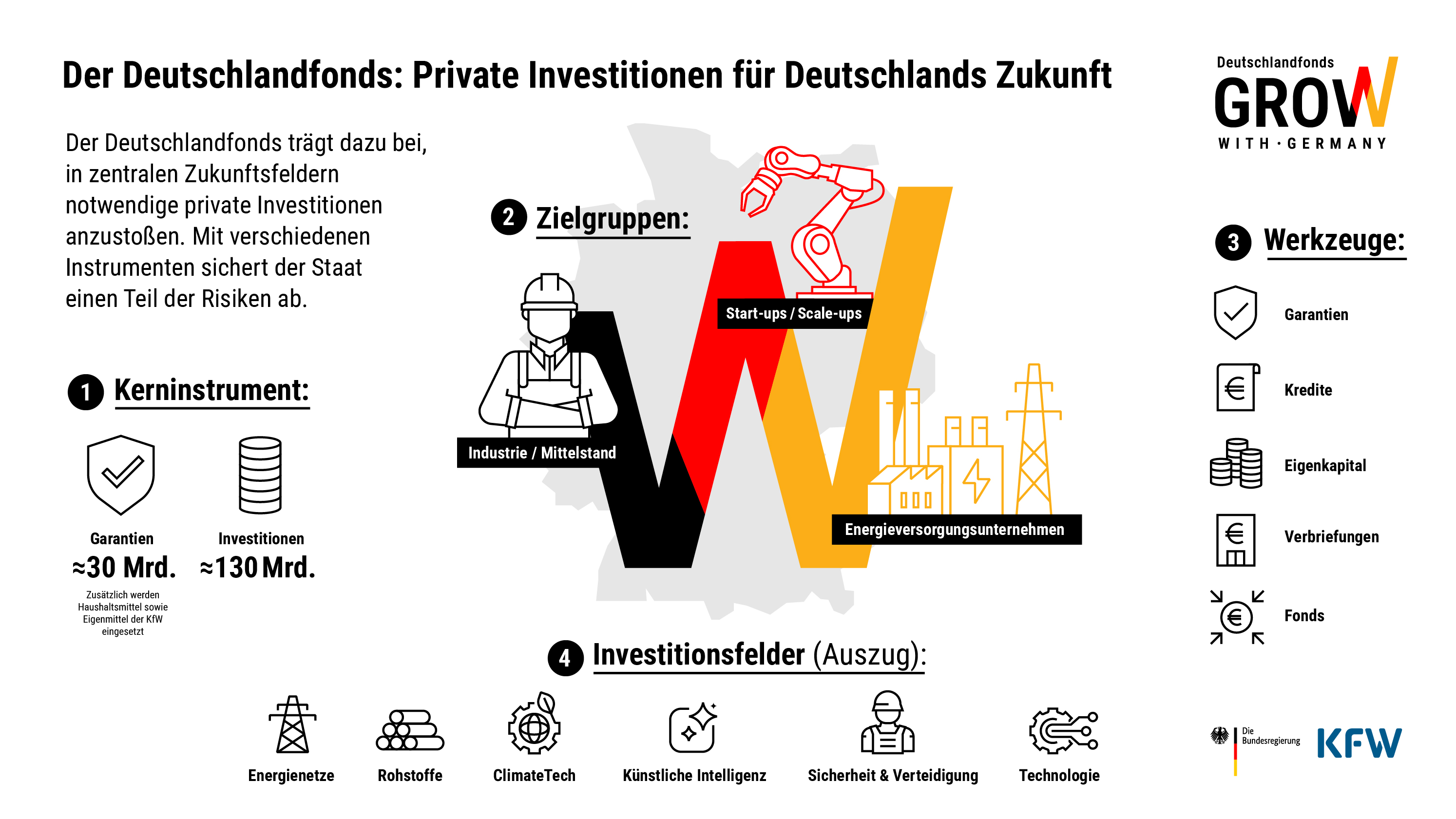 Der Deutschlandfonds soll privates Kapital für Investitionen mobilisieren, um die Wettbewerbsfähigkeit und Zukunftsfähigkeit der deutschen Wirtschaft zu stärken.