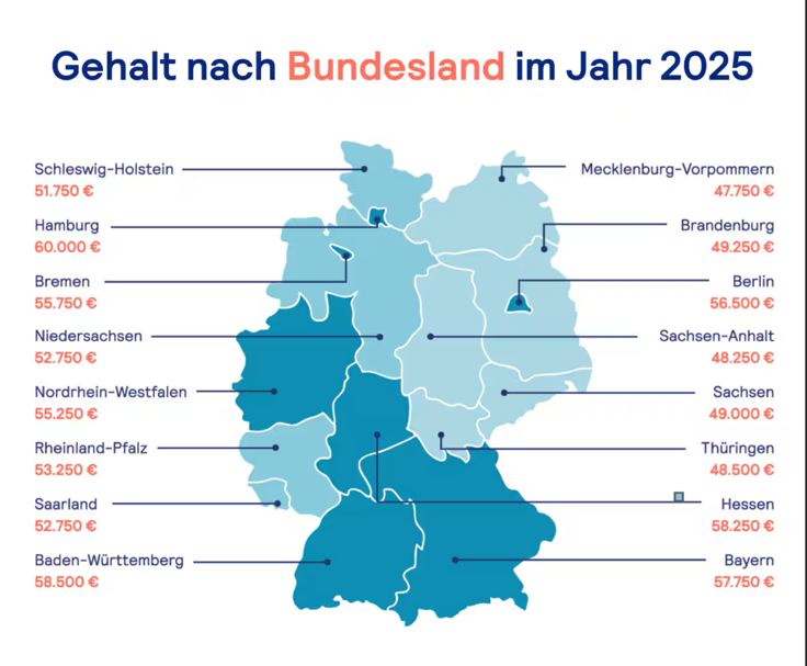 Spitzenreiter unter den Bundesländern ist nach der Auswertung von Stepstone der Stadtstaat Hamburg. Das liegt vorwiegend daran, dass dort wichtige Großunternehmen (Airbus, Hapag-Lloyd, Otto-Group) ihren Sitz haben, die vergleichsweise gut zahlen.