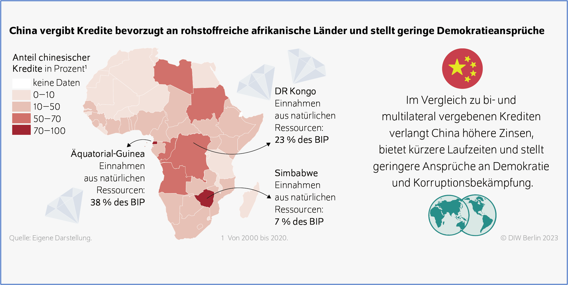 Die chinesische Außenwirtschaft folgt damit einer knallharten Interessenpolitik: Staatskredite gegen Minenkonzessionen und Infrastrukturprojekte gegen langfristig gesicherte Rohstofflieferungen. So modernisierte China Eisenbahnlinien wie die Tazara-Verbindung in Tansania, um im Nachgang nichjt ganz uneigennützig den Abtransport von Kupfer und Kobalt aus Sambia und der Demokratischen Republik Kongo effizienter zu organisieren.