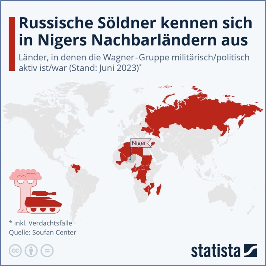 Während China seinen Einfluss in Afrika durch Infrastrukturprojekte, Kreditvergaben und langfristige Handelsabkommen ausbaut, nutzt Russland ein anderes Instrument: militärische Präsenz für den direkten Zugriff auf Rohstoffkonzessionen. Seit vielen Jahren sind russische Söldner und private Sicherheitsfirmen unter anderem im Niger (Uran) aktiv. Auch in der Zentralafrikanischen Republik (Gold, Diamanten) und im Sudan (Gold) ist russische Einflussnahme dokumentiert. In der Zentralafrikanischen Republik erhielten mit Russland verbundene Unternehmen Zugang zu Gold- und Diamantvorkommen, im Sudan stehen Goldkonzessionen im Mittelpunkt.