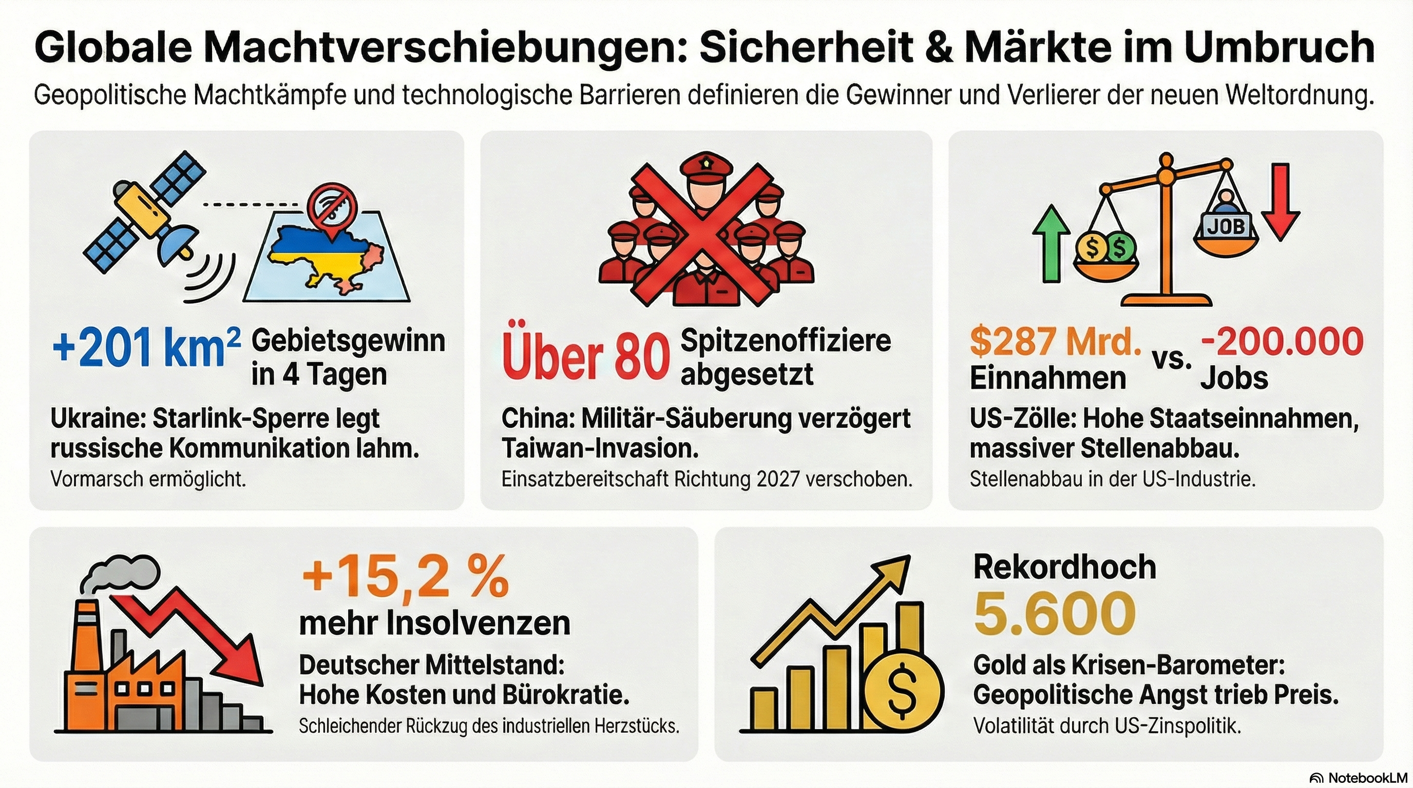 Die behandelten Themen sind entscheidend, da sie eine Phase verdeutlichen, in der sicherheitspolitische Allianzen, technologische Kriegsführung und globale Wirtschaftsmärkte gleichzeitig radikalen und unvorhersehbaren Veränderungen unterworfen sind. Einerseits verschieben drastische militärische Umstrukturierungen in China und die offenkundig kriegsentscheidende Starlink-Sperre in der Ukraine die unmittelbaren militärischen Machtverhältnisse in den aktuellen und potenziellen Konfliktregionen.