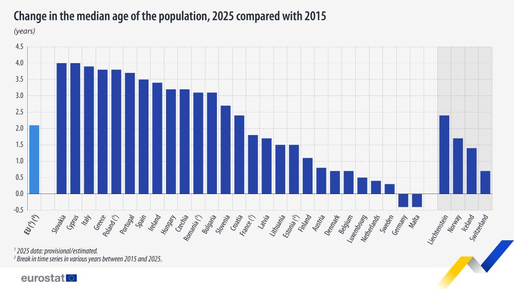 Der Alterungsprozess betrifft nahezu alle Länder der EU. Seit 2015 ist das Medianalter überall gestiegen – mit Ausnahme von Deutschland und Malta, die jeweils einen leichten Rückgang von 0,4 Jahren verzeichneten. Besonders ausgeprägt war die Alterung in der Slowakei und Zypern, wo das Medianalter innerhalb einer Dekade um 4 Jahre zulegte. In Italien betrug der Zuwachs 3,9 Jahre, gefolgt von Griechenland und Polen mit jeweils 3,8 Jahren.