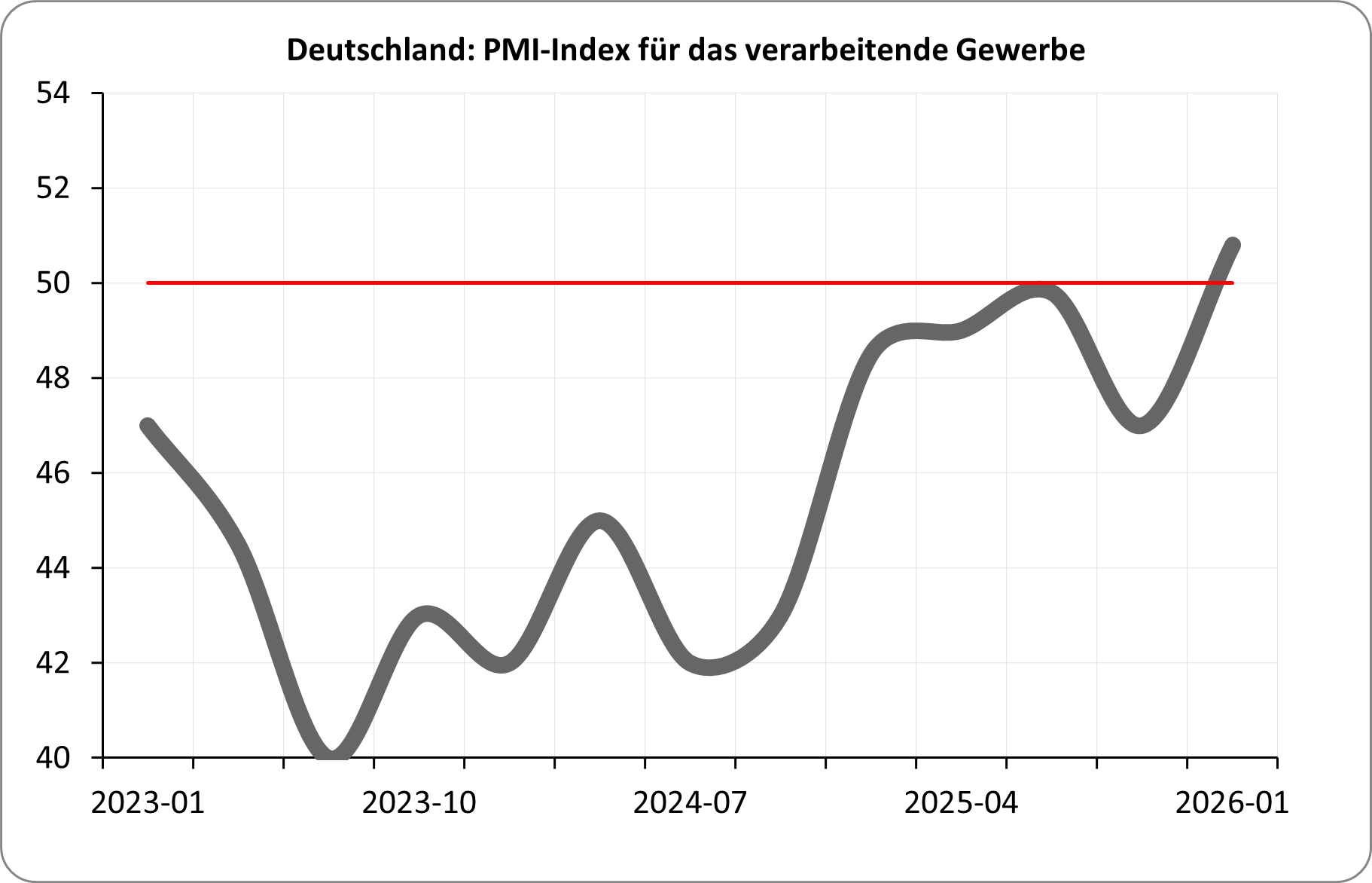 Zur Einordnung: Der PMI basiert auf Umfragen unter Einkaufsmanagern. Werte über 50 signalisieren Expansion, Werte darunter einen Rückgang der wirtschaftlichen Aktivität. Da der Index sehr früh im Monat vorliegt, gilt er als wichtiger Frühindikator für die konjunkturelle Entwicklung.