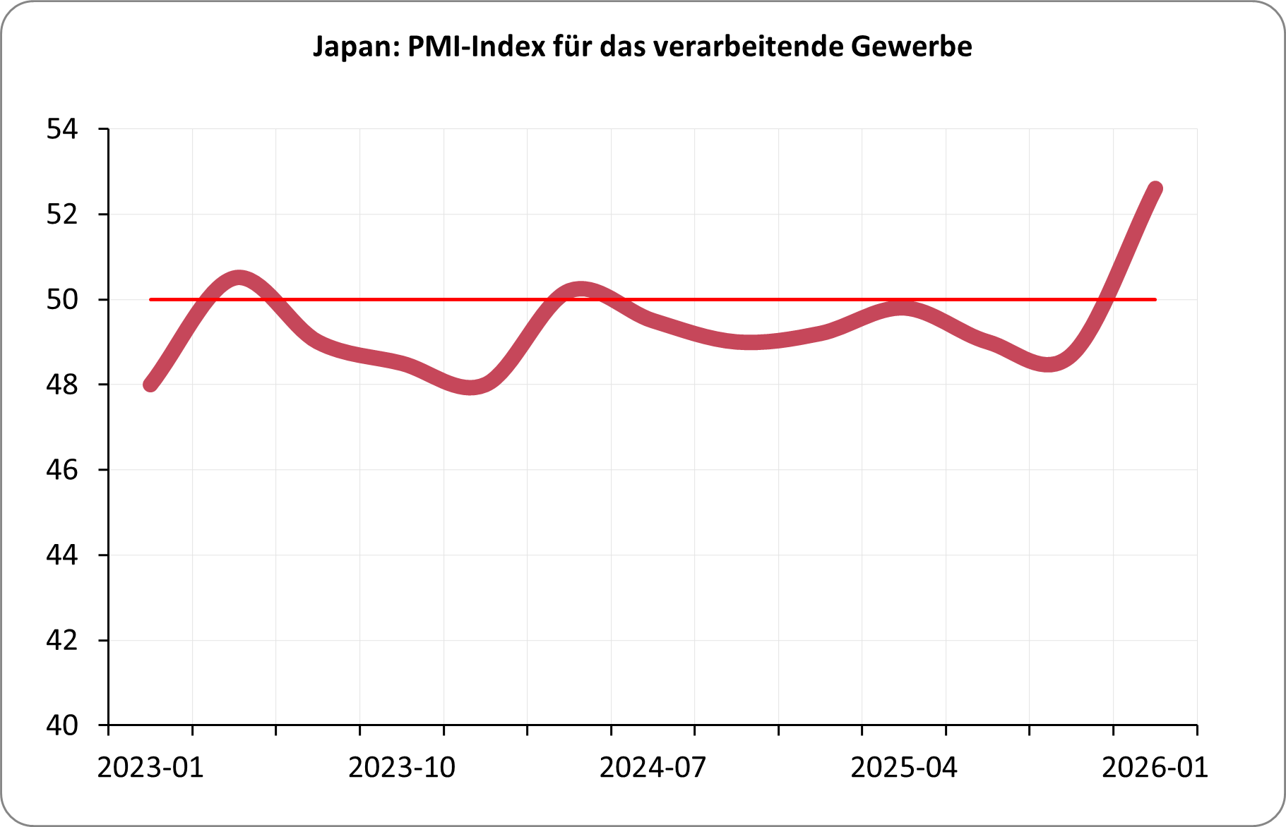 In Japan stieg der vorläufige PMI für das verarbeitende Gewerbe im Februar auf 52,8 Punkte, nach 51,5 im Januar. Das ist der höchste Wert seit Mai 2022 und einer der stärksten Werte der vergangenen Jahre. Besonders dynamisch entwickeln sich die Auslandsaufträge, die so schnell wachsen wie seit acht Jahren nicht mehr. Unternehmen berichten zudem von zunehmender Preissetzungsmacht, was in der traditionell inflationsschwachen japanischen Wirtschaft bemerkenswert ist. Zusätzlichen Rückenwind erhält die Konjunktur durch politische Impulse. Nach dem Wahlsieg von Premierministerin Sanae Takaichi wird eine stärkere Förderung der Binnennachfrage erwartet, was die Zuversicht in der Industrie weiter stützt.