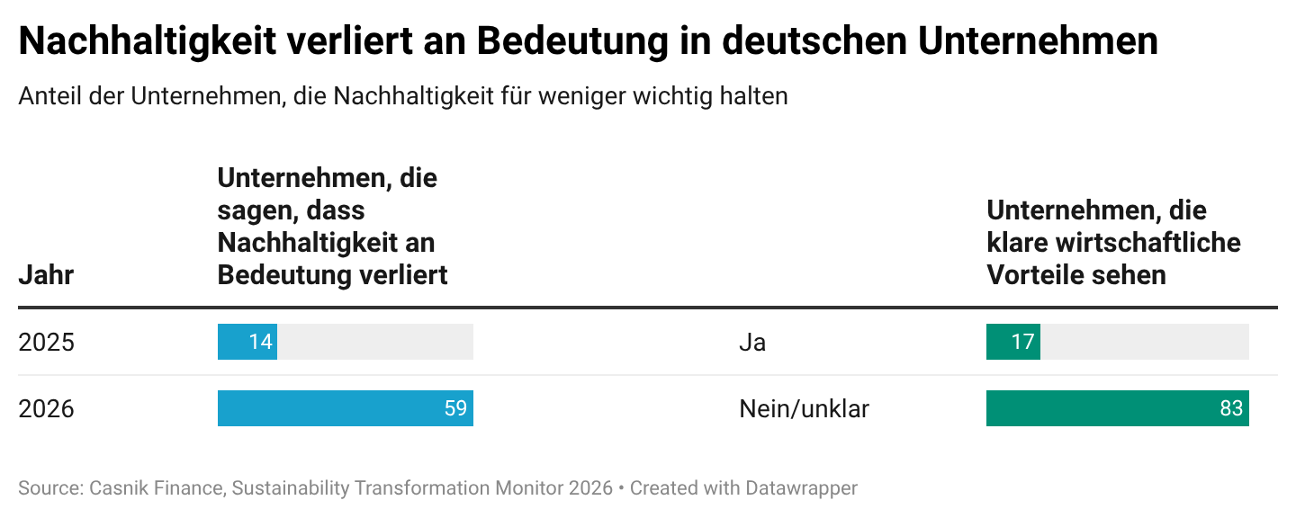 Noch vor wenigen Jahren gehörte Nachhaltigkeit zu den zentralen Themen der deutschen Wirtschaft. Klimaschutz, gesellschaftliche Verantwortung und der Übergang zu nachhaltigeren Geschäftsmodellen standen weit oben auf der Agenda vieler Unternehmen. Heute berichten jedoch zahlreiche Firmen, dass das Thema an Bedeutung verliert. Insgesamt 59 Prozent der befragten Unternehmen geben an, dass Nachhaltigkeit innerhalb ihrer Organisationen an Gewicht verliert. Im Jahr zuvor vertraten lediglich 14 Prozent diese Ansicht.