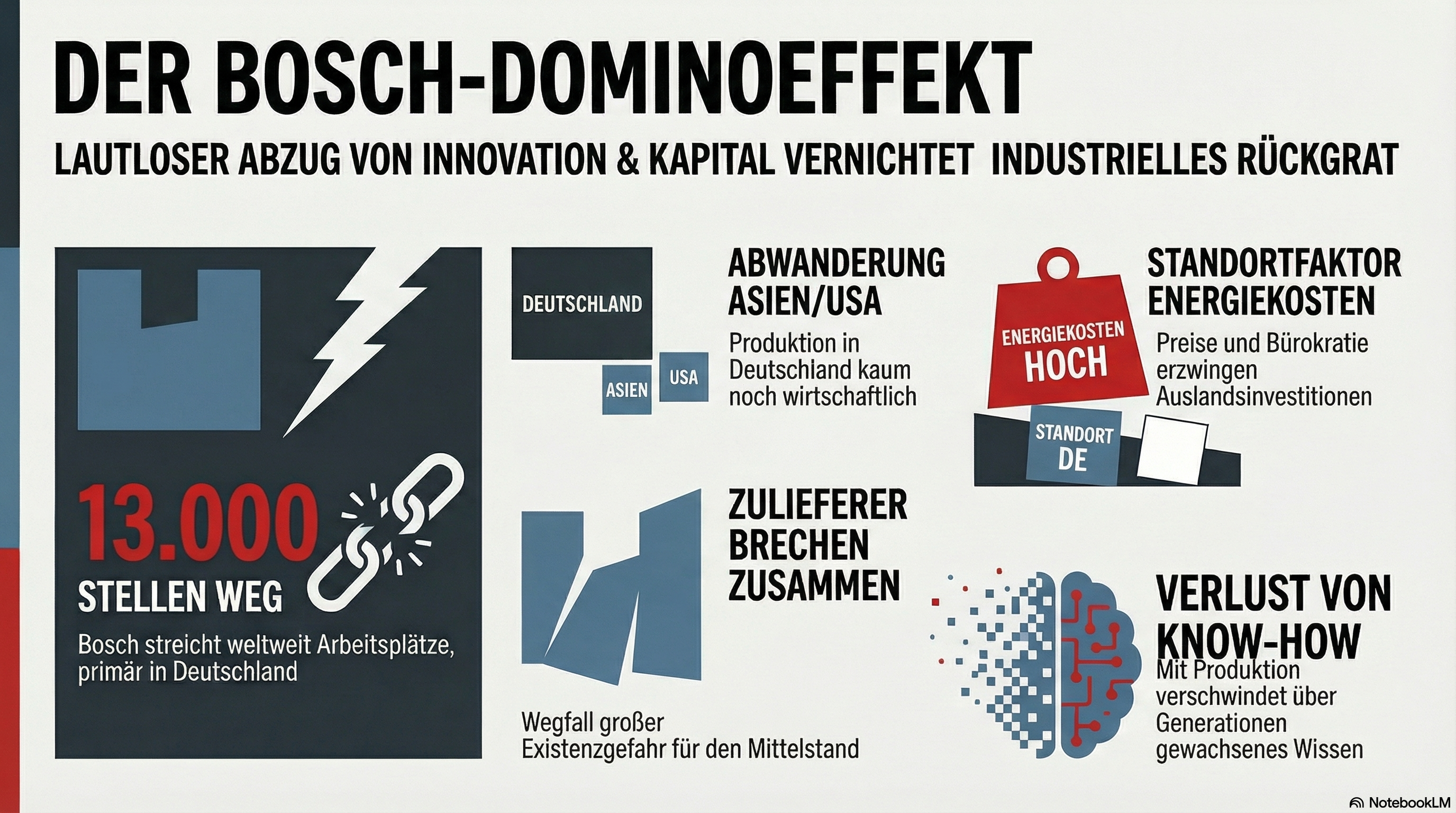 Der Bosch-Dominoeffekt:Der Stellenabbau beim Technologiekonzern Bosch offenbart die akute Gefahr der Deindustrialisierung in Deutschland, die durch hohe Standortkosten, teure Energie und Bürokratie vorangetrieben wird. Für das eng verflochtene Netzwerk aus mittelständischen Zulieferern bedeutet dieser Dominoeffekt und der abrupte Wechsel zur Elektromobilität oft eine existenzielle Bedrohung und den Verlust von wertvollem Know-how.