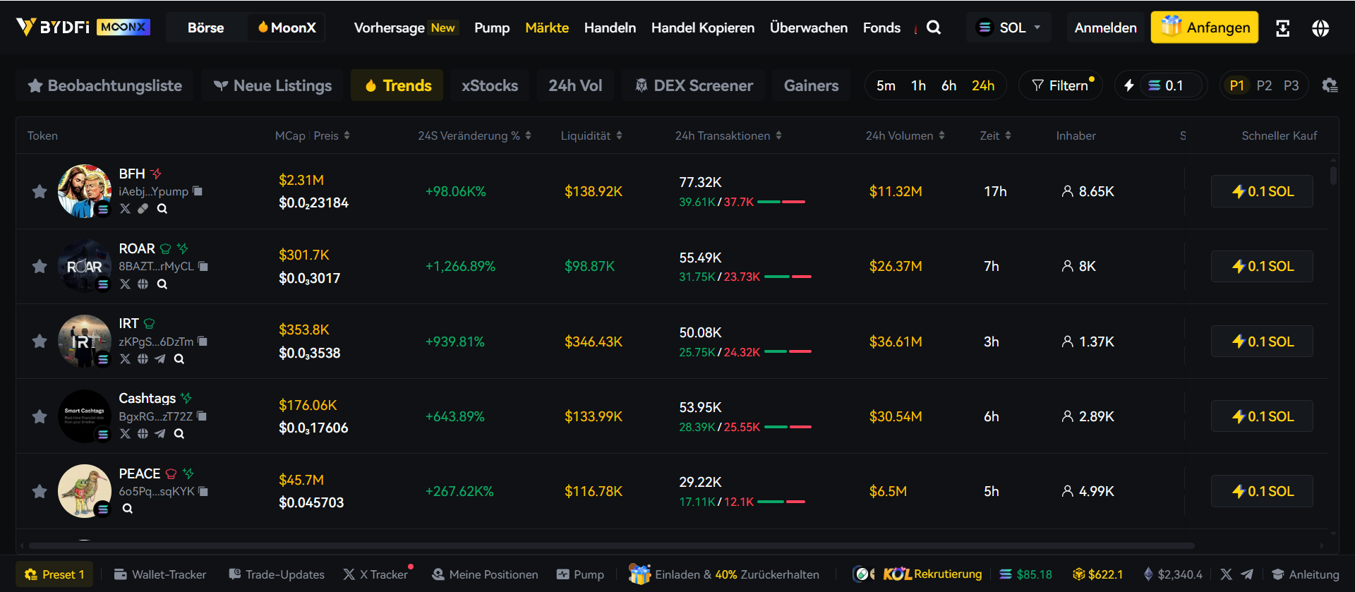 Kein separates Produkt, sondern direkt in die Börse eingebettetes On-Chain-Trading-Tool. Seit April 2025 verfügbar, mit Unterstützung für Solana, BNB Chain und Base. Zum Funktionsumfang gehören Markets, Trade, Pump (Token-Launch-Plattform, 2026 aufgewertet), Copy Trade, Monitor und Portfolio.