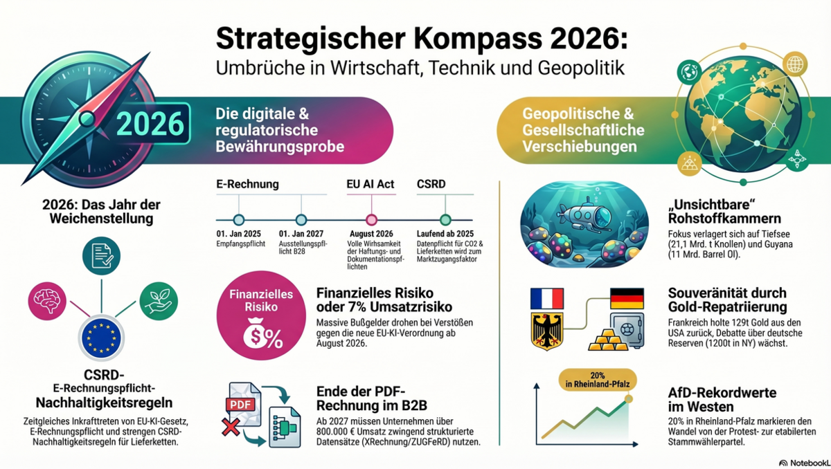 In unserer neuen Podcast-Folge nehmen wir diese Unsicherheiten ernst und ordnen das Chaos für Sie: Wir beleuchten den stetigen Aufstieg der AfD trotz anhaltender Skandale, decken versteckte Datenschutzrisiken in Ihrem WhatsApp-Chat auf und erklären, warum dem deutschen Mittelstand eine radikale digitale Transformation bevorsteht. Darüber hinaus reisen wir zu den verborgenen Schauplätzen künftiger globaler Rohstoffkriege, diskutieren die Schweizer Pläne für eine strenge Bevölkerungsobergrenze, analysieren den strategischen Goldabzug Frankreichs aus den USA und werfen einen kritischen Blick auf die harten Umstrukturierungen beim deutschen Solar-Vorreiter Enpal.