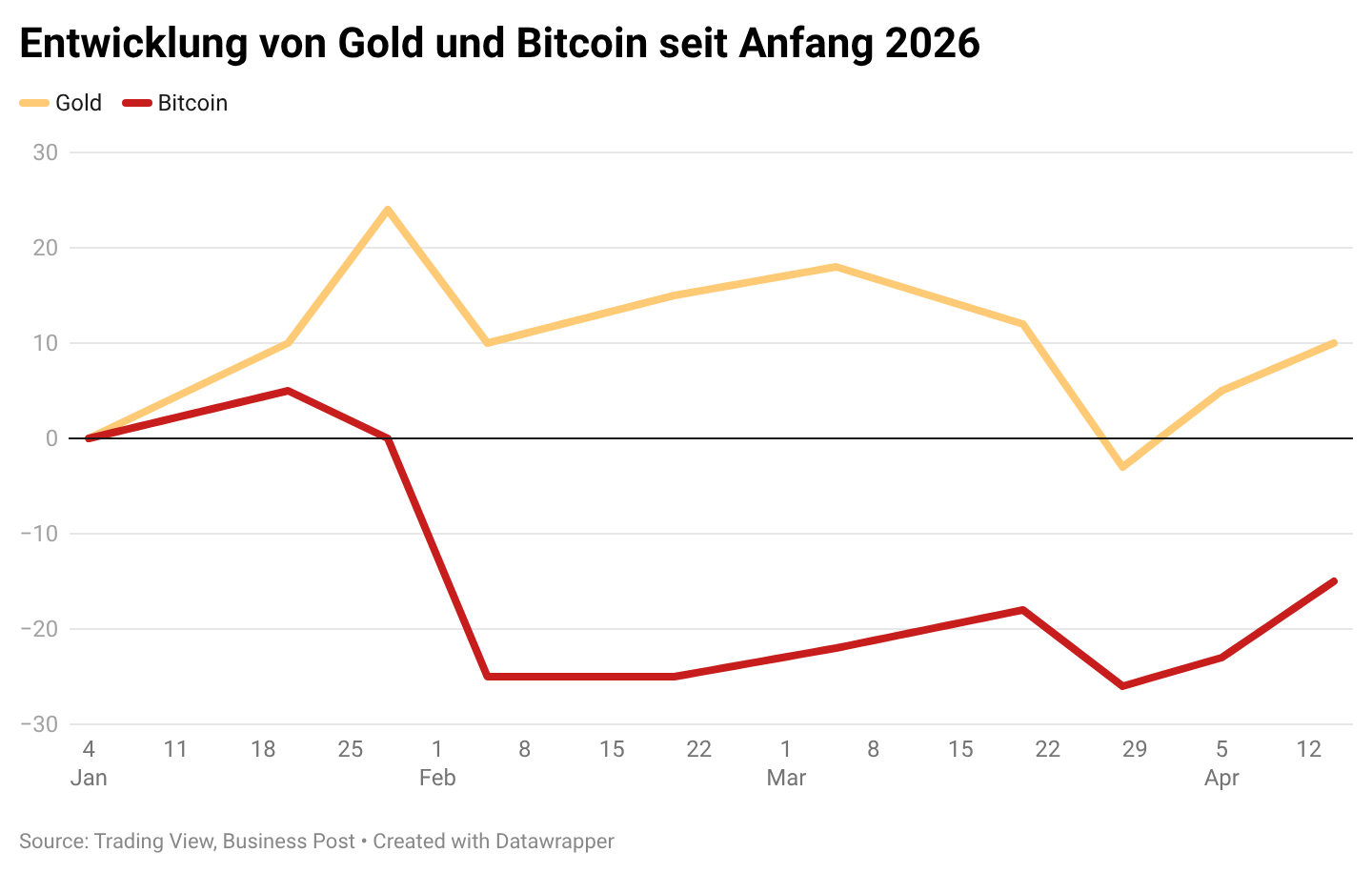 Neben dem Goldpreis richtet sich der Blick vieler Anleger auch auf den Bitcoin-Kurs. Die Kryptowährung wird häufig als digitales Pendant zu Gold betrachtet und gilt in bestimmten Investorengruppen als Absicherung in Krisenzeiten. Angesichts der wirtschaftlichen Unsicherheiten und geopolitischen Spannungen wäre daher auch hier ein deutlicher Preisanstieg zu erwarten gewesen. Doch auch der Bitcoin-Kurs entwickelte sich anders.